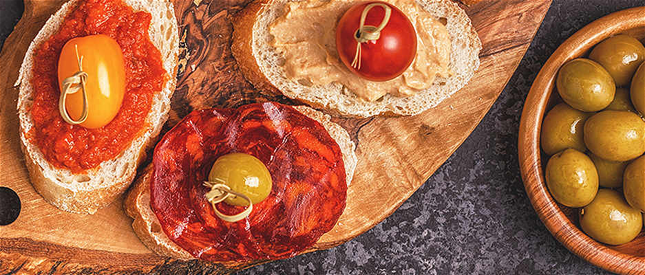 Voor 2 personen. Koude tapas: feta, diverse vleeswaren, carpaccio wrap, zalm wrap, olijven mix en sweet pepper, tortilla chips, geserveerd met brood met verschillende dips. Warme tapas: albondigas (rundergehakt in tomatensaus), allas de pollo ( gemarineerde kippenvleugels), gambas al horno (gebakken gepelde garnalen), twister friet, biefstukreep met rajas
